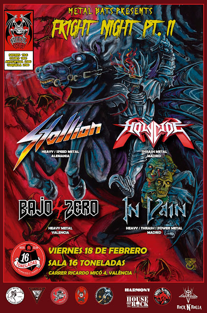 En Metal Bats queremos despedir el 2021 como toca y por eso os desvelamos el cartel completo de la que será la segunda edición de la Fright Night, que se celebrará el viernes 18 de febrero en la sala 16 ToneladasAdemás de los ya confirmados Stallion desde Alemania, el cartel contará con las siguientes bandas:Desde Madrid Holycide, banda de thrash metal creada por el vocalista de Avulsed Dave Rotten que vendrán a presentar su segundo trabajo "Fist To Face" y a repartir cera.A la cita no podían faltar los valencianos 4 Bajo Zero, banda con la que Metal Bats teníamos muchas ganas de colaborar. Acaban de publicar su nuevo single el cual descargarán junto con sus otros temas en una actuación de puro heavy metal.También desde Madrid contaremos con la presencia de In Vain, una de las formaciones que más están dando que hablar los últimos años. Con su recién álbum "All Hope Is Gone" publicado, nos deleitarán con su mezcla de power, thrash y heavy metal para volarnos las cabezas.Las entradas podrán comprarse a partir de la semana que viene a través de Entradium y próximamente en puntos físicos que anunciaremos, al precio de 15€ socios de Metal Bats, 18€ miembros de otros clubs, 20€ anticipada y 24€ en taquilla.Como siempre, mencionar el enorme trabajo de nuestro ilustrador Madness y del equipo gráfico del club por haberse currado un cartel tan espectacular.Os esperamos el próximo mes de febrero para una noche que nadie puede perderse!